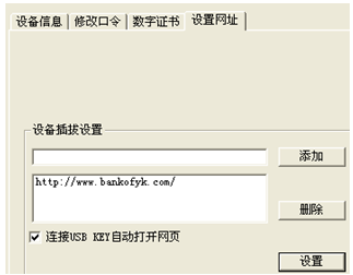 ②原因是沒有勾選自動(dòng)打開網(wǎng)頁。雙擊小黃鎖或者是我行EK圖標(biāo)——設(shè)置網(wǎng)址,進(jìn)入下圖畫面,將我行網(wǎng)址www.chenkunkeji.com添加入列表,勾選“連接USB KEY自動(dòng)打開網(wǎng)頁” ,且點(diǎn)擊設(shè)置。