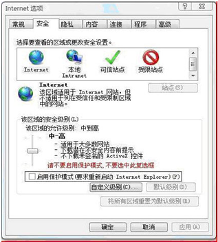 ?、苋绻莣in7或者是vista系統(tǒng),請關(guān)閉IE的保護(hù)模式,如下圖: